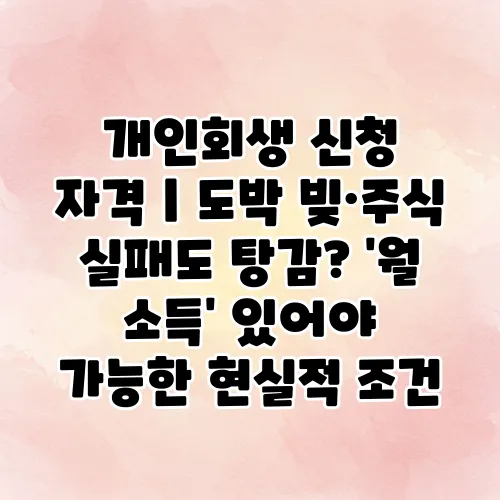 개인회생은 많은 사람들이 빚의 부담에서 벗어나 새 출발을 할 수 있도록 도와주는 제도입니다. 특히 도박 빚이나 주식 실패로 인한 채무, 그리고 월 소득이 적어 걱정하는 분들에게는 더욱 중요한 내용이 될 수 있는데요. 오늘은 개인회생 신청 자격과 함께, 도박 빚이나 주식 실패로 인한 채무도 탕감 가능 여부, 그리고 월 소득 기준과 같은 현실적인 조건들을 상세하게 살펴보겠습니다. 복잡하고 어려운 내용을 쉽고 친절하게 풀어 설명드리니, 부담 갖지 마시고 함께 차근차근 알아보도록 해요.