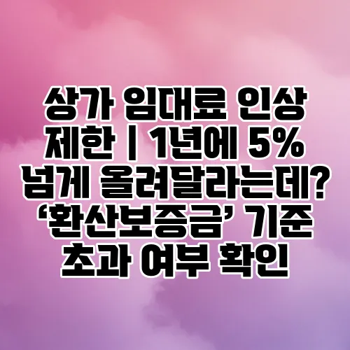 상가 임대료 인상이 5%를 초과하는지 여부는 '환산보증금'을 기준으로 판단합니다. 환산보증금은 임대료를 보증금으로 환산한 금액으로, 이를 통해 임대료의 적정성을 평가합니다. 만약 환산보증금이 법적으로 정해진 기준을 초과한다면, 임대료 인상은 제한될 수 있습니다.