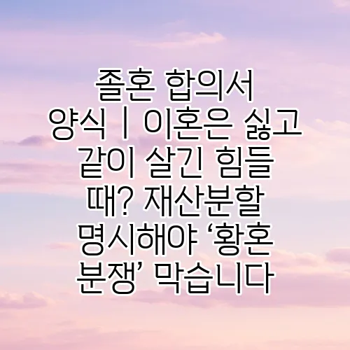 오늘은 많은 부부들이 직면하는 현실적인 문제인 졸혼 합의서와 관련된 중요한 정보를 상세히 소개하려고 합니다. 특히, 이혼을 원하지 않지만 함께 살기 힘든 상황에서 어떻게 하면 서로의 권리와 재산을 명확히 하여 황혼 분쟁을 예방할 수 있을지에 대해 깊이 있게 살펴보겠습니다. 결혼 생활이 오래 지속되면서 자연스럽게 생기는 여러 가지 갈등과 고민 속에서, 재산분할과 같은 계약서 작성은 더 이상 피할 수 없는 현실이 되었습니다. 이러한 내용을 통해 여러분의 부부 생활에 작은 도움이 되었으면 하는 바람입니다.