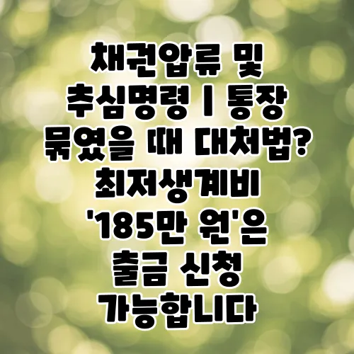 채권압류 또는 추심명령으로 통장이 묶였을 경우, 먼저 법원이나 채권자의 통지 내용을 확인하고, 법적 절차에 따라 이의신청이나 정당한 사유가 있음을 소명할 수 있습니다. 또한, 최저생계비인 185만 원 이내 금액은 출금 신청이 가능하므로, 이를 고려하여 필요한 금액만 출금하거나, 관련 법률 상담을 받는 것이 중요합니다.